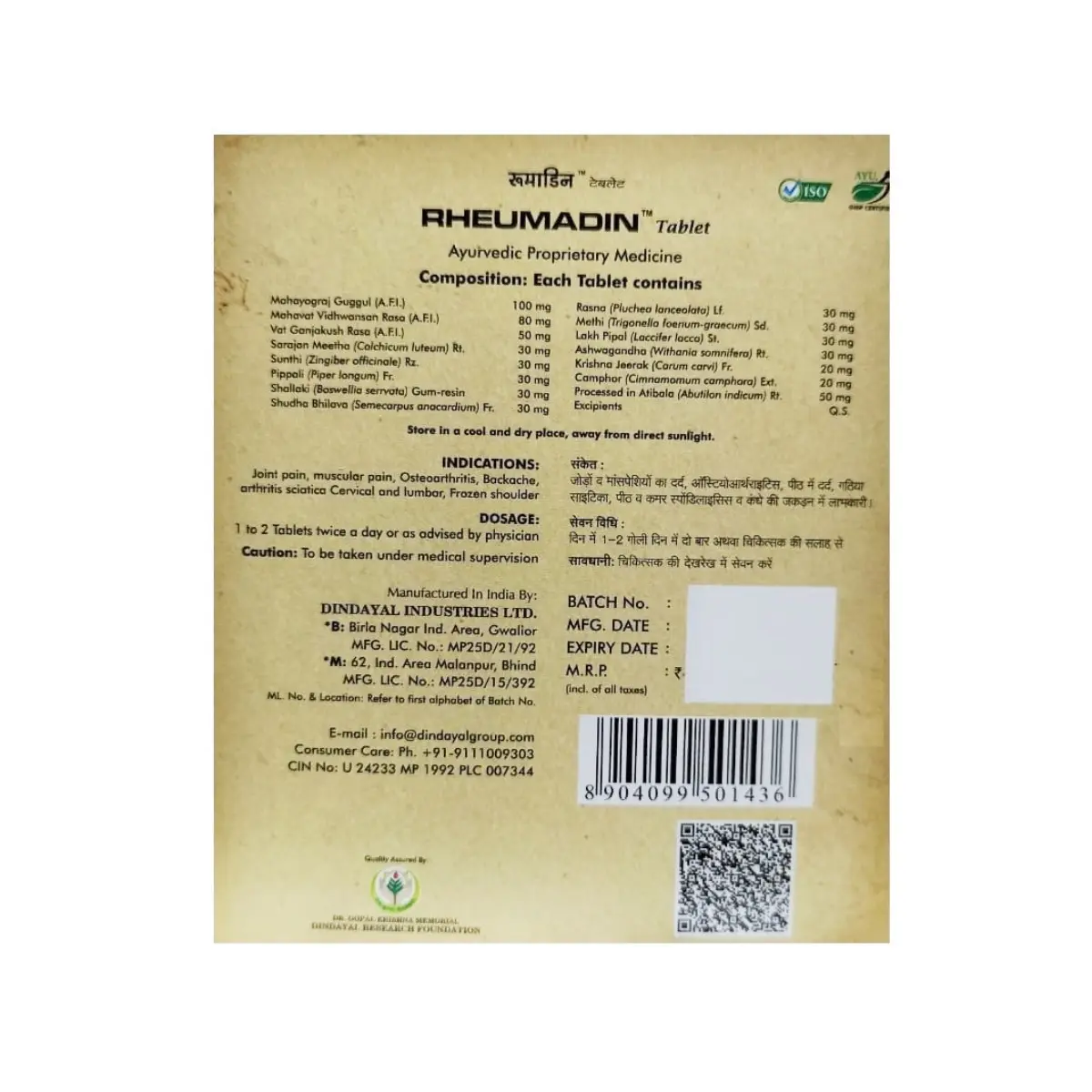 Rheumadin Tablet is a powerful and safe solution for long-lasting relief from joint pain and stiffness. It works quickly to reduce inflammation, ease joint pain, and improve flexibility and movement. By increasing joint lubrication, Rheumadin helps prevent further damage to the joints and cartilage. It is suitable for use in all forms of arthritis and is gentle enough for long-term use with no known side effects.